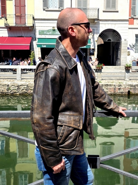Modello: Aviator Tipo: Giubbotto aviatore / Flight jacket Colore: Marrone invecchiato Taglia L Vestibilità indicativa: In foto sono 180 cm fisico normale e mi veste bene (vedere misure) Materiale esterno: Vera pelle Fodera interna: perfetta Collo: a camicia Chiusura: Zip in metallo Condizioni: condizioni eccellenti Guarda le misure e informazioni sulla taglia