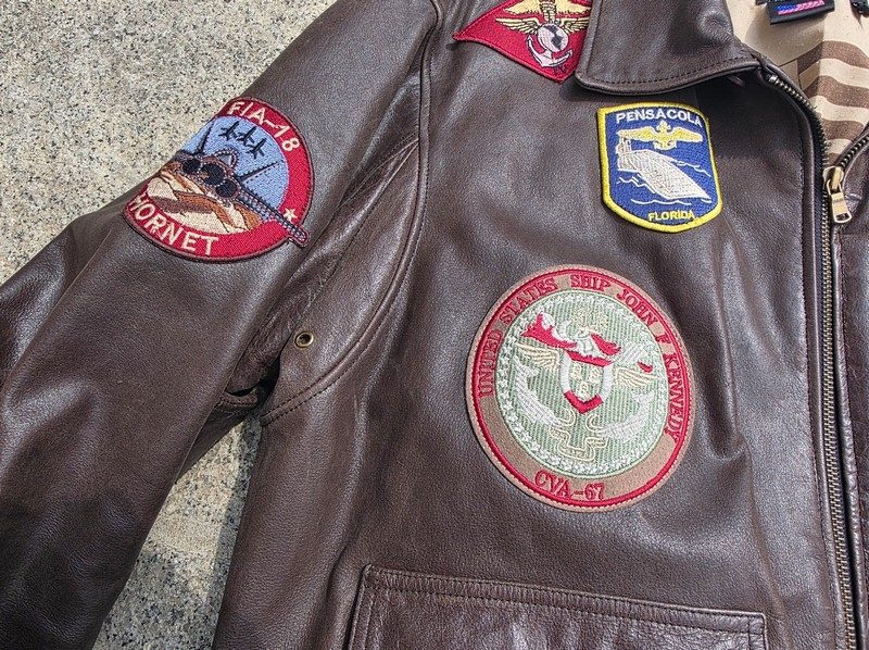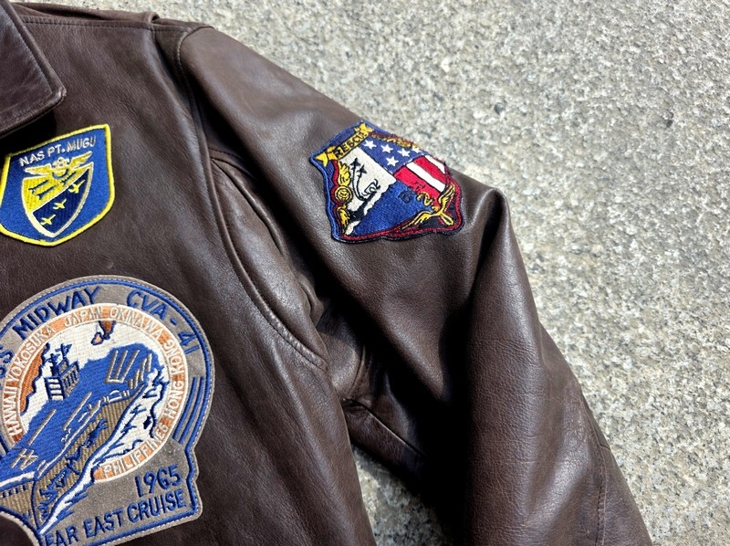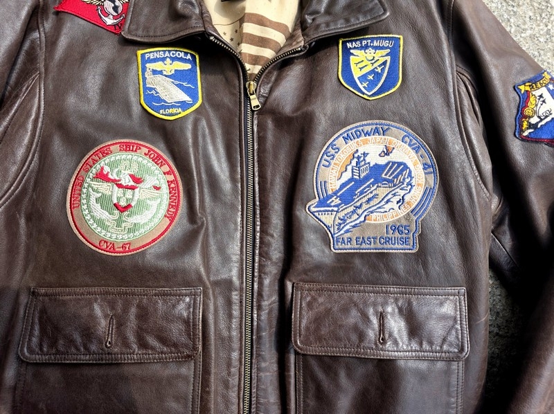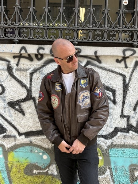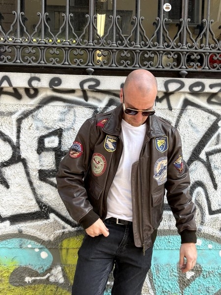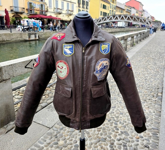 Marca: Schott Modello: Top Gun Tipo: Giubbotto aviatore / Flight jacket Colore: Marrone scuro Taglia etichetta: L Vestibilità indicativa: L normale. in foto sono 180 cm fisico normale veste bene Materiale esterno: Vera pelle Fodera interna: perfetta Collo: a camicia Chiusura: Zip in metallo Polsini fascia: Maglia elasticizzata Patch: patch aeronautiche Stagione: tutto l'anno Condizioni: Ottime condizioni vintage – mancano solo i due bottoni sulle tascheGuarda le misure e informazioni sulla taglia