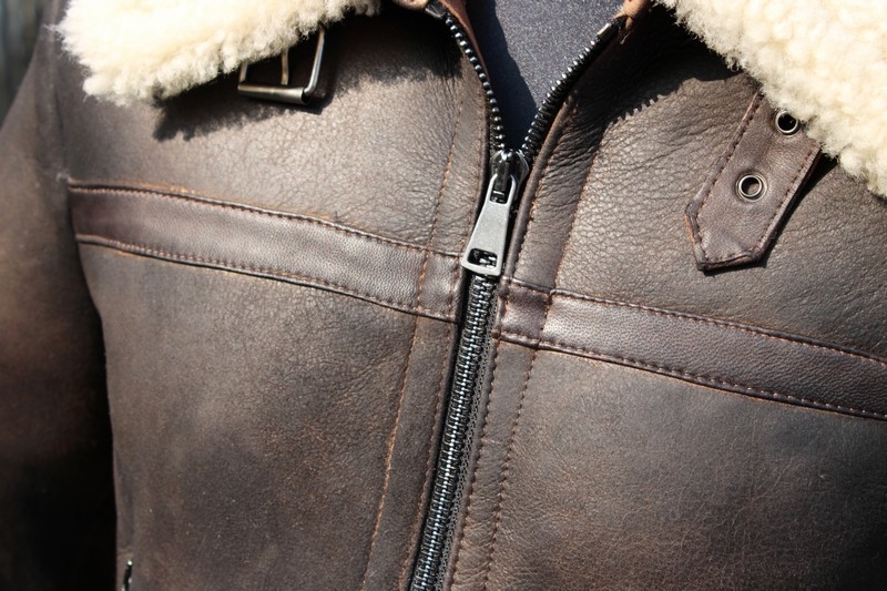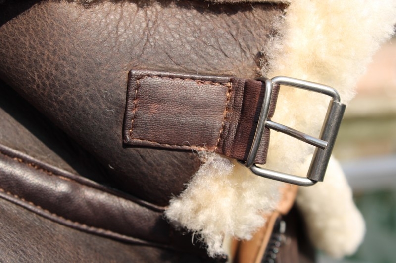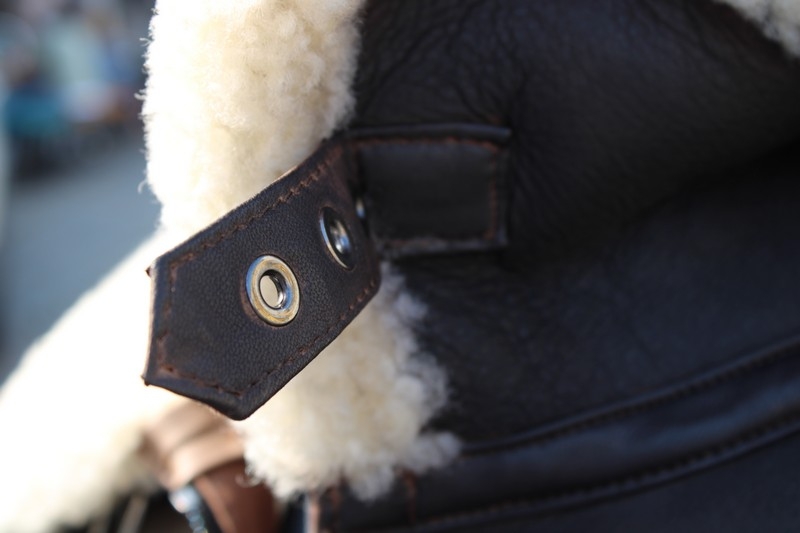 Ispirazione aviatore vintage con dettagli autentici: zip in metallo, collo alto con fibbie, taglio sartoriale. Pelle esterna di alta qualità, interno in pelliccia di montone autentica